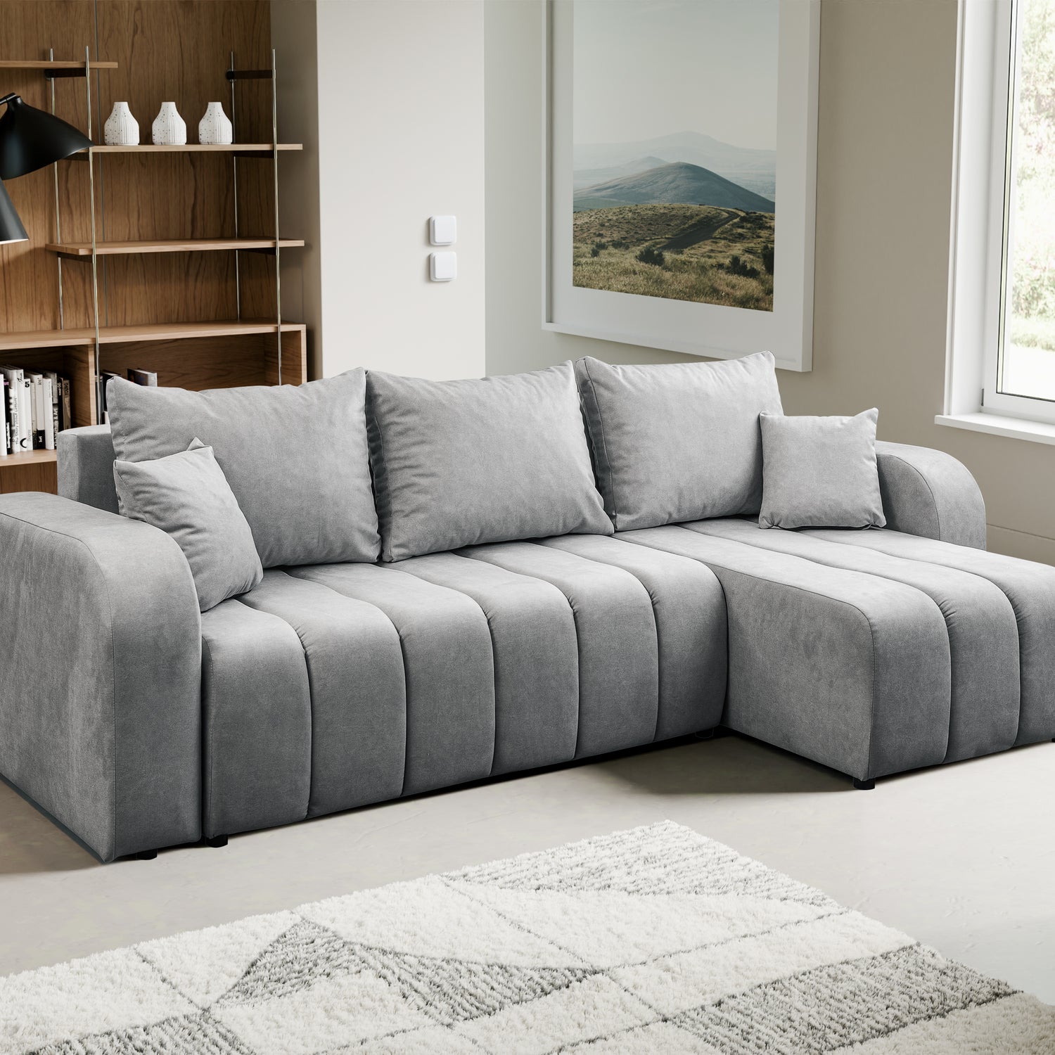 The corner sofa has a large sleeping area and practical containers for bedding.