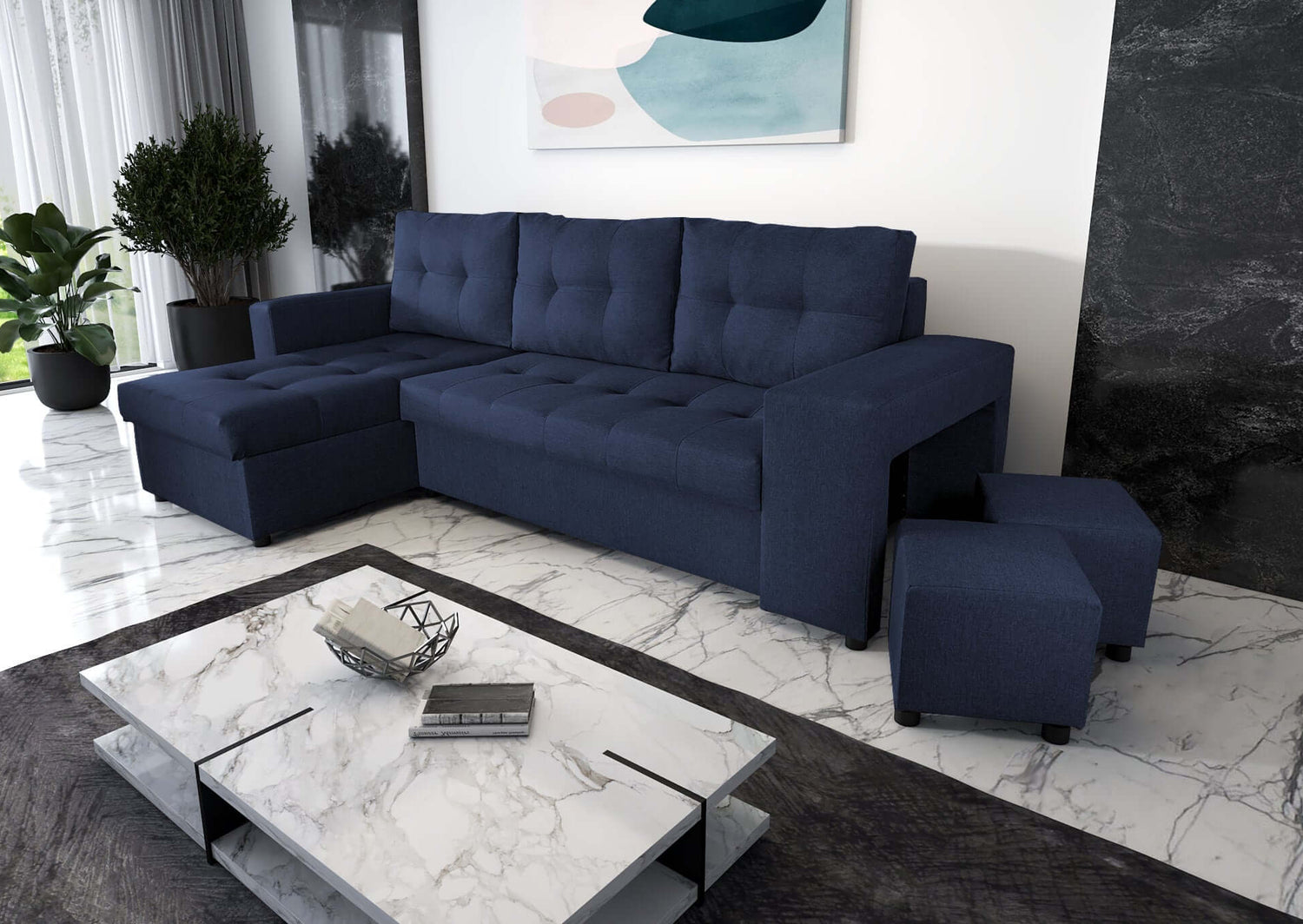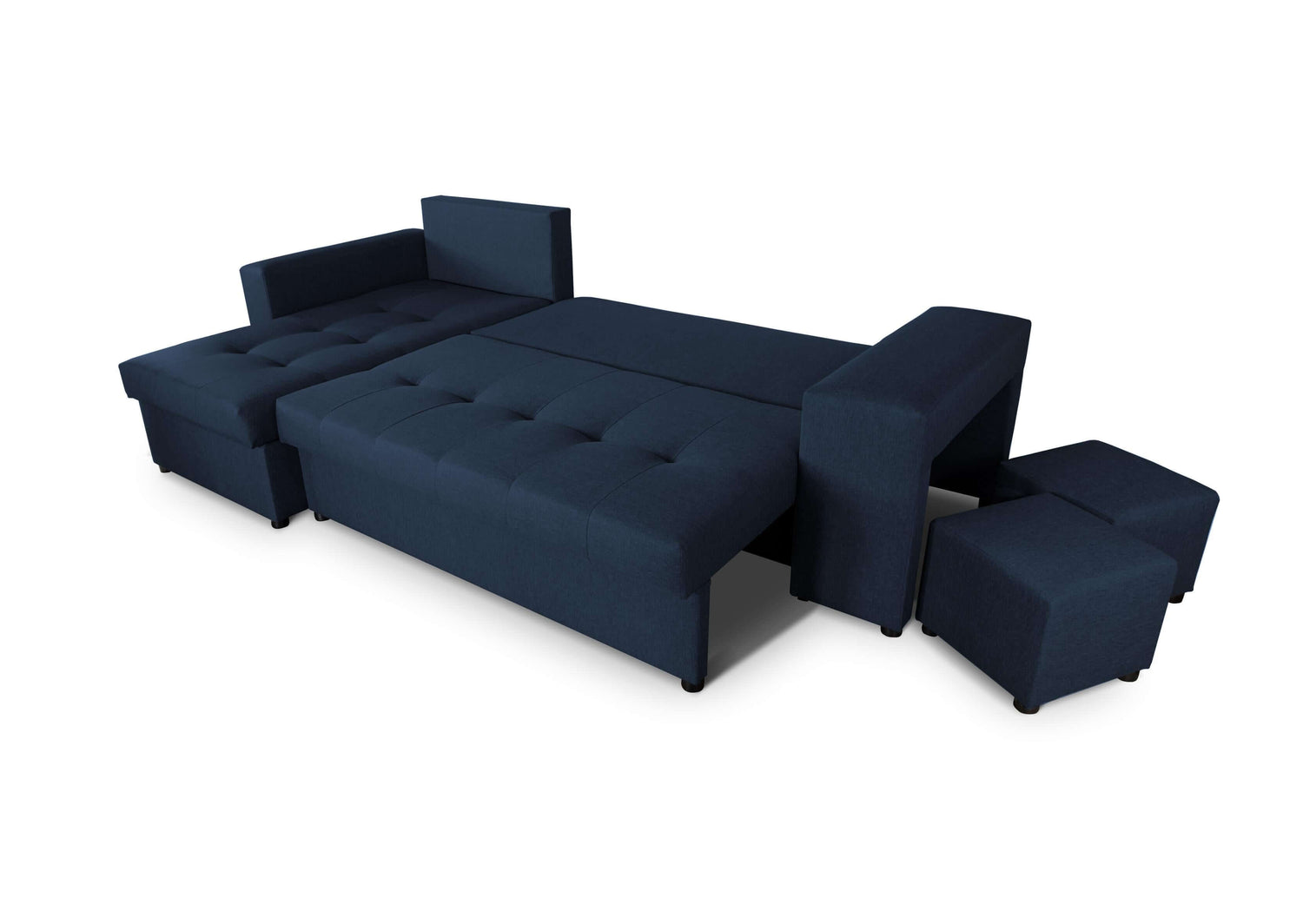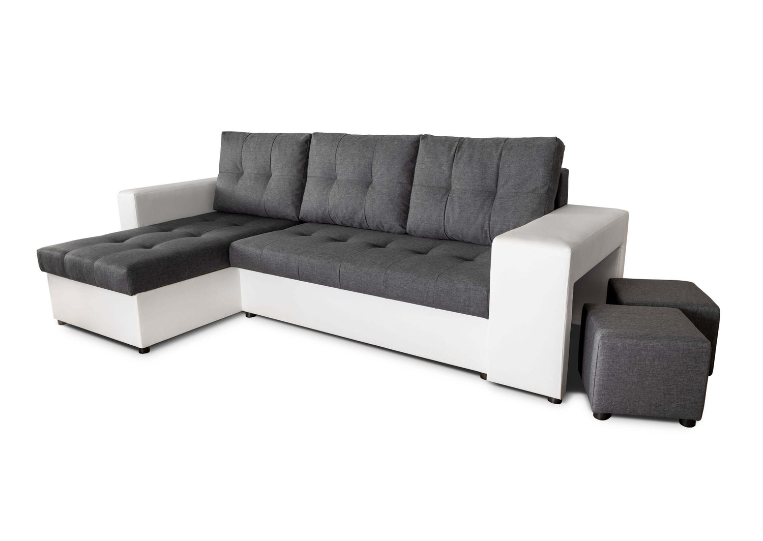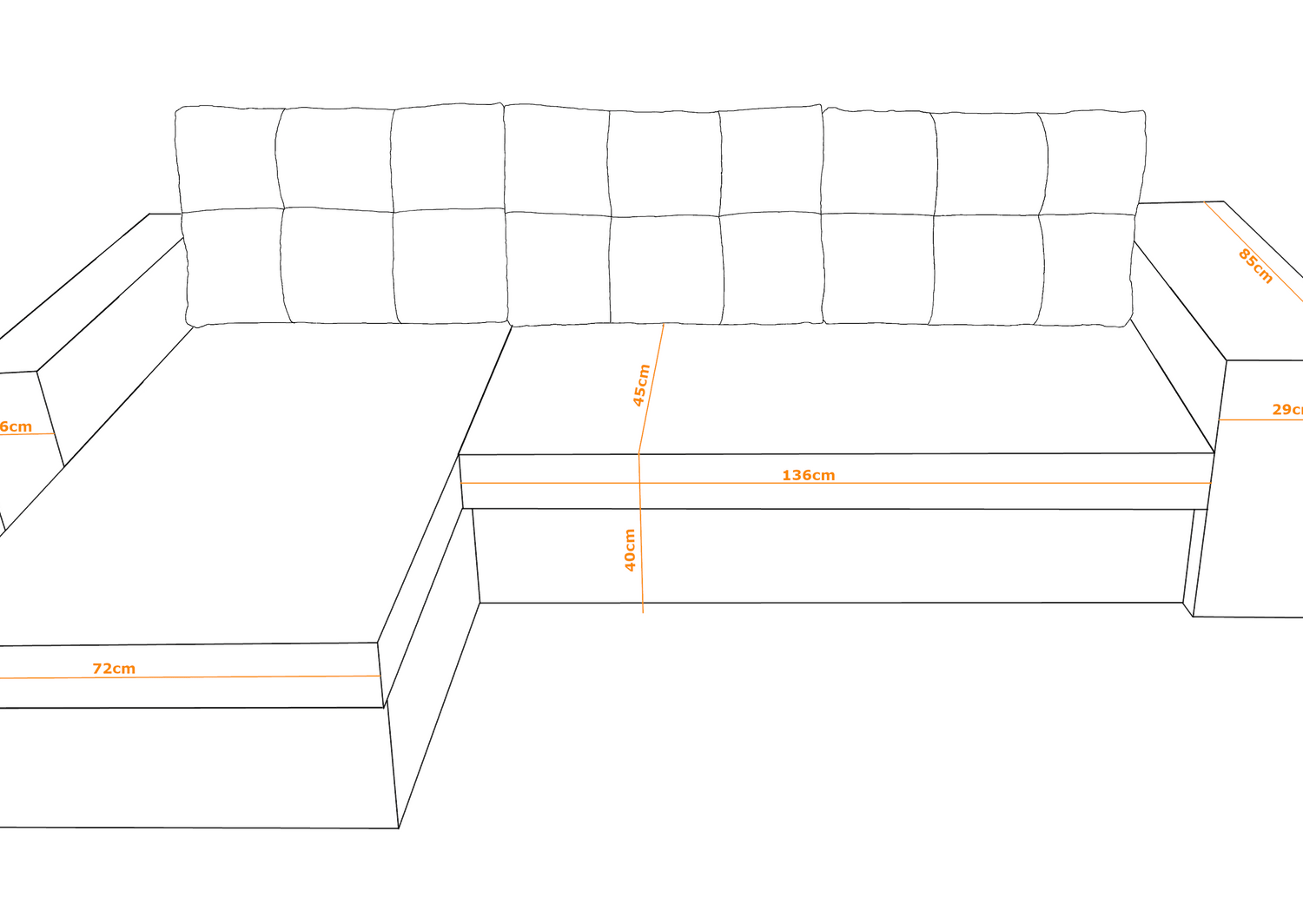 The corner sofa has two large containers for bedding shown in the photos, three large quilted back cushions with a zipper, quilted seats and a sleeping function included in the price.