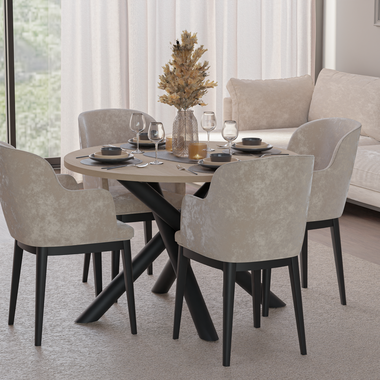 The OSLO DINING TABLE is a stunning collection of modern living room tables, boasting metal spider legs with a striking geometric, branched design. Not only do these legs add an aesthetic touch, but they also provide sturdy support for large tops. Available in four colors and featuring a round or oval top, these tables exude exceptional style and elegance. Perfect for modern, minimalist, industrial, glamorous, or eclectic room designs.